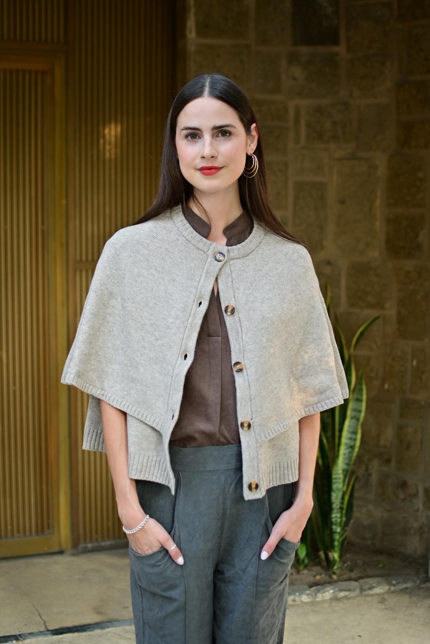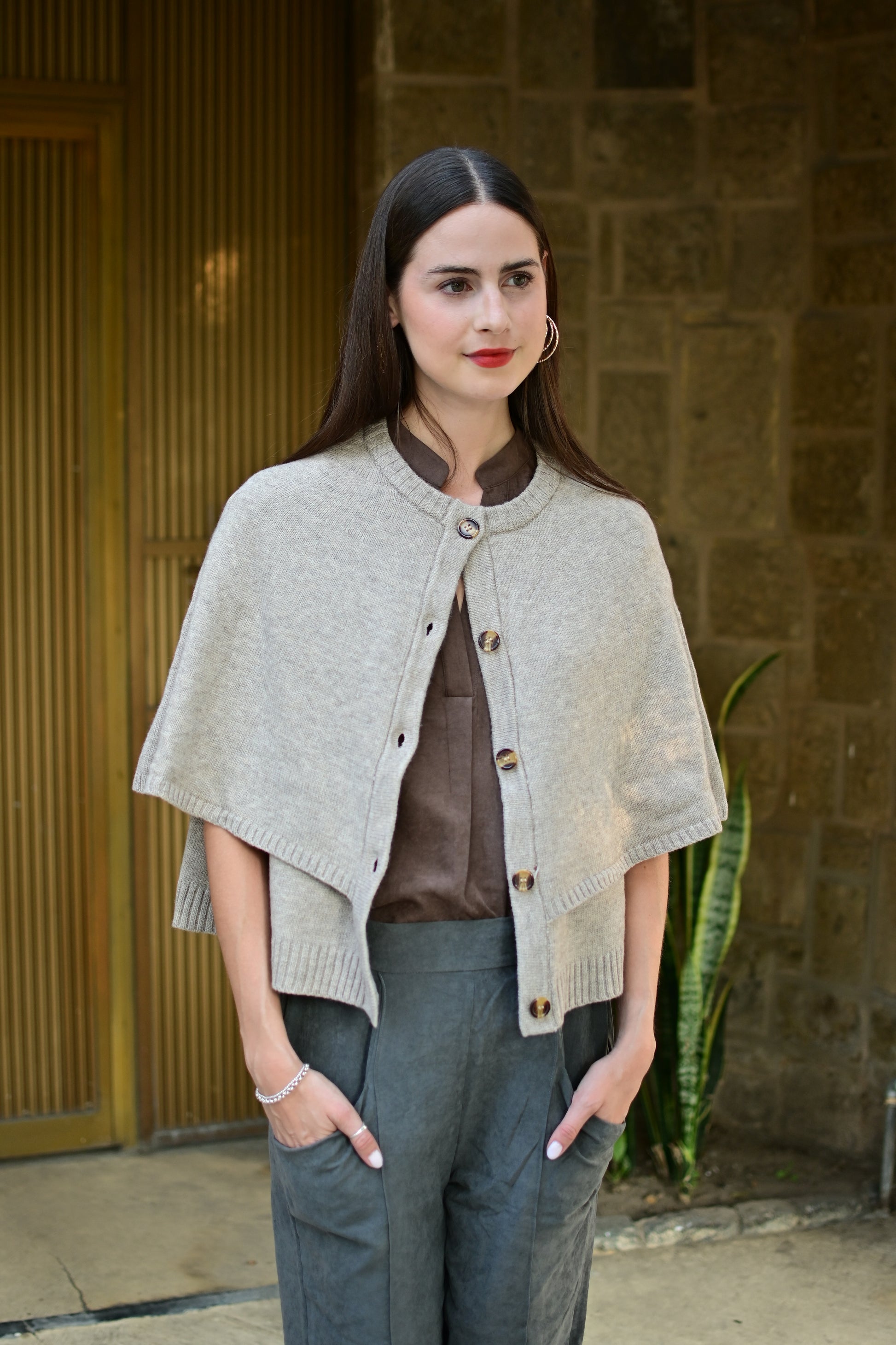 Suéter tipo capa color taupe con botones y manga 3/4.